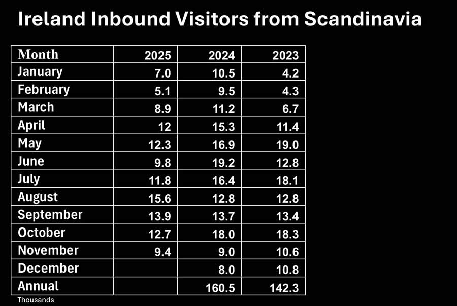 • Visitors from Scandinavia were up 4.4pc on last year,, rolling annual was