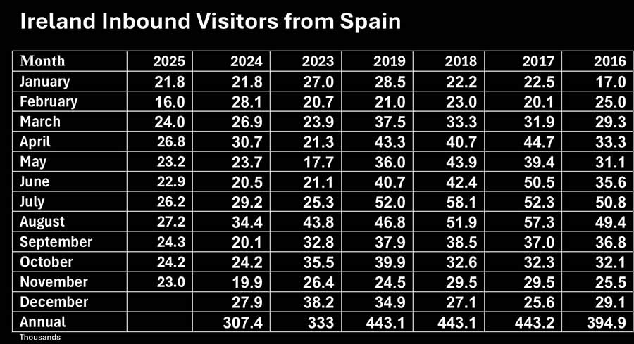 • Visitors from Spain and Portugal were up 15.6pc on last year and down 6.1pc on pre-pandemic,  rolling annual was 287,500 down 9.5pc on the 12 months to November 2024.