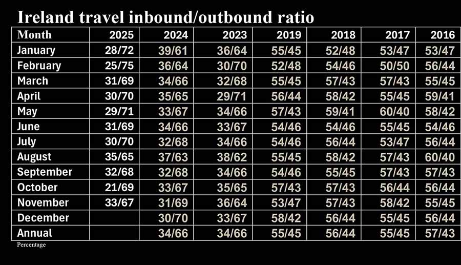 The ratio of inbound to outbound in November 2025 was 33/67, compared with the predominantly inbound ratios that are found in pre-pandemic statistics, such as 58/41 in November 2017.