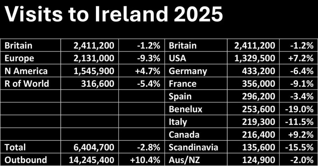 Edward Duffy shared “The visitors’ expenditure in Ireland (excluding fares) was €287m in January 2026. Visitors from Continental Europe accounted for €101m (35pc), Britain for €85m (30pc), North America for €59m (20pc) and visitors from the Rest of the World for €43m (15pc). Taken together, this represented an increase of 34pc when compared with January 2025, and a decrease of 3pc compared with January 2024.”