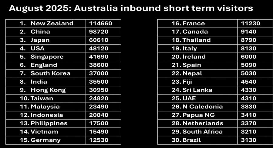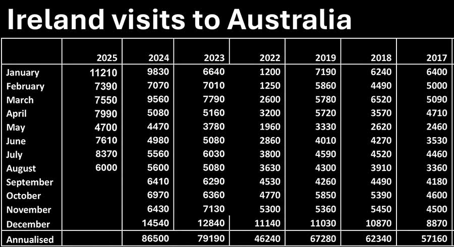 Australia hosted 6,000 short term visits from Ireland in August, up 7.1pc on 2024 and 39.1pc on pre-pandemic.