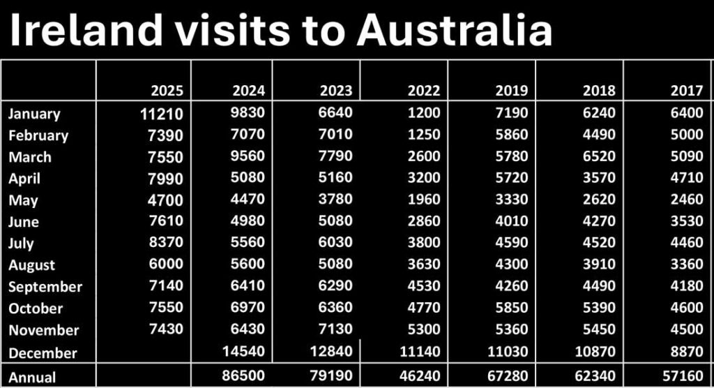Ireland sent 7430 visits to Australia in November, up 15.6pc on 2024 and 38.6pc on pre-pandemic. Rolling annual was 97,480, up 15pc on the twelve months to November 2024.