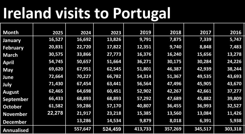 Portugal hosted 22,278 visitors from Ireland in November 2025, up 1.6pc on 2024. Rolling annual was 562,436 up slightly 0.6pc on the twelve months to November 2024,
