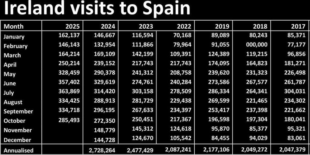 Ireland travel to Spain was 285.493 visits in October, up 4.6pc on 2024 and 45.2pc on pre pandemic. Year to date was 2,479,757 up 10.2pc. Rolling annual was 3,020,581, up 9.8pc.