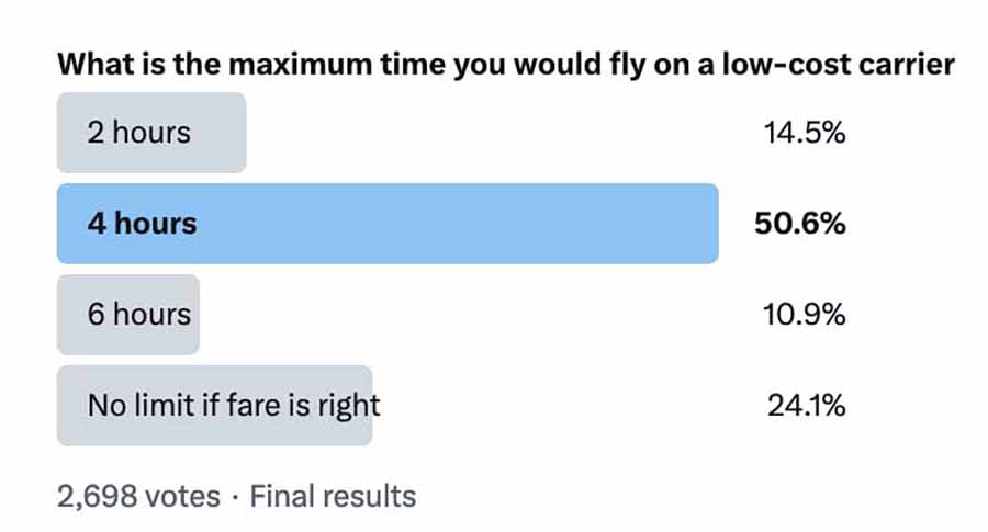 A poll conducted on Twitter/X by Simon Calder for the London Independent revealed that two-thirds of respondents will not fly for more than four hours on low-cost airlines..
