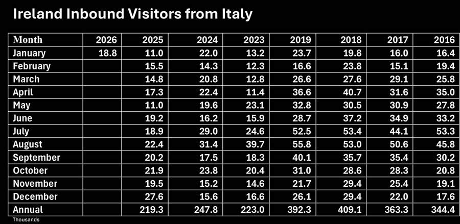 Visitor numbers to Ireland from Italy in January are up 70.0pc on January 2025 and down -20.7pc on pre-pandemic