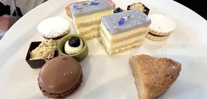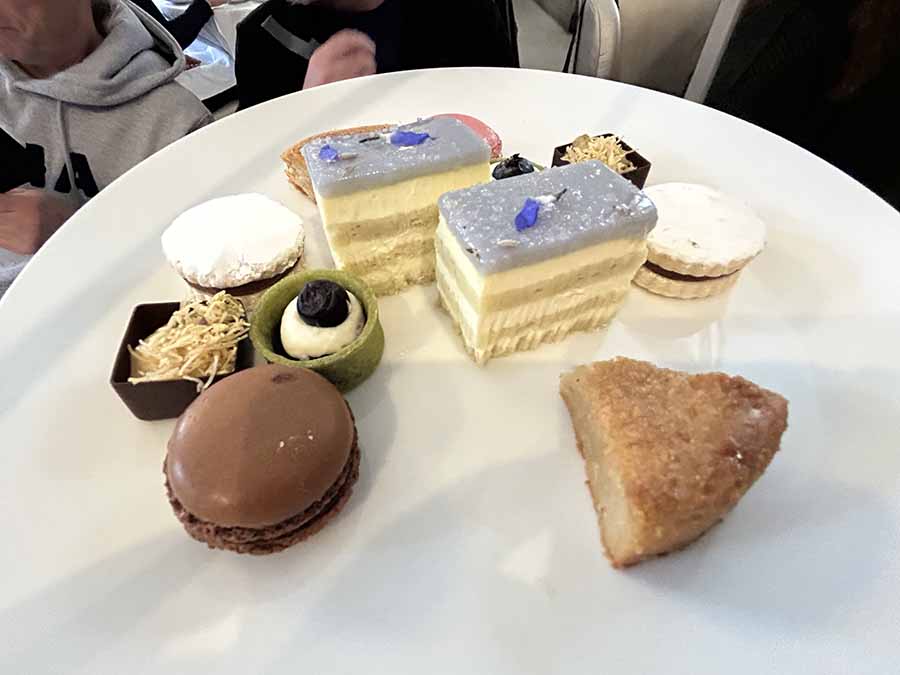 - Top Tier (Sweets): A selection of petit fours and desserts, like French macarons, fruit tarts, chocolate mousse cups, or seasonal bites such as lemon lavender opera cake. The quality is high, though some find the sweets less remarkable than the savories.