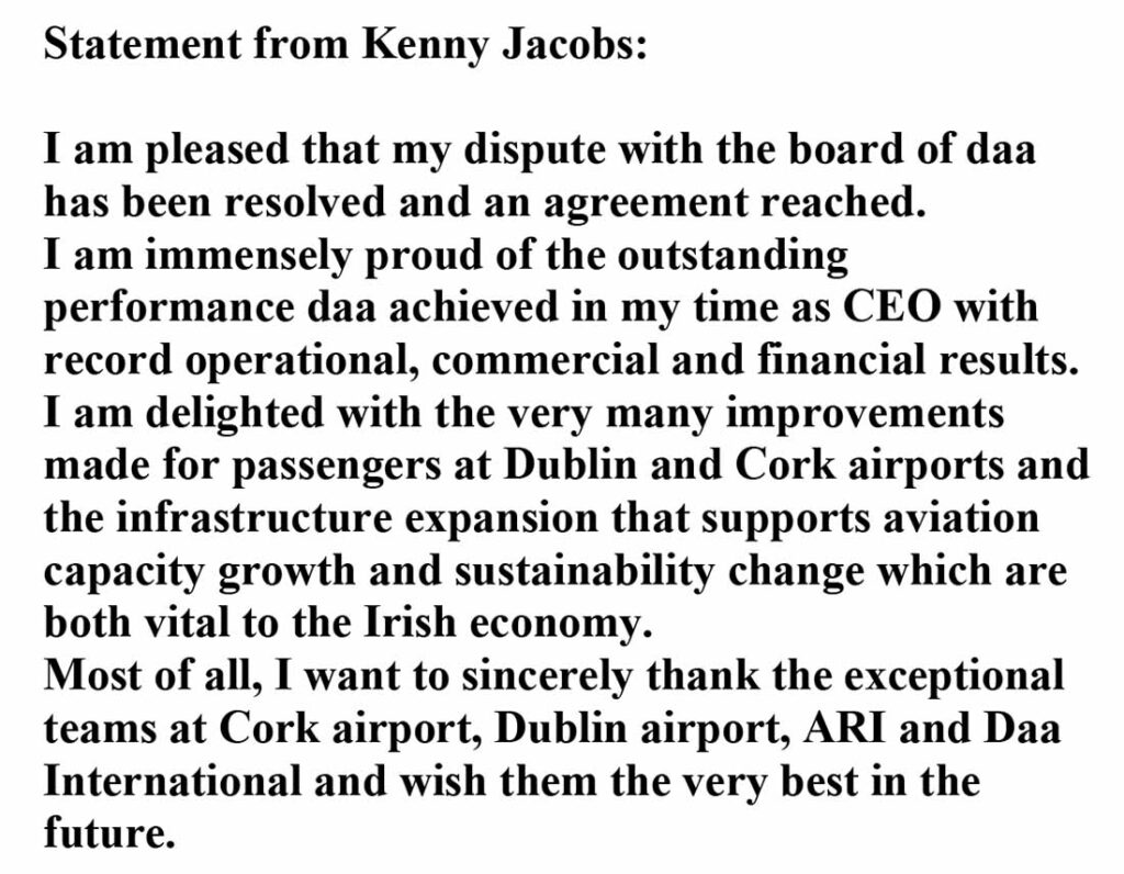 Mairead McKenna SC shared: “The board of DAA and Mr Jacobs acknowledge the contribution made by the entire management team and staff to the operational and commercial success of DAA and recognise the positive impact the DAA has on the Irish economy. The dispute was resolved on terms that are mutually agreeable, pursuant to which Mr Jacobs will voluntarily step down as chief executive.”