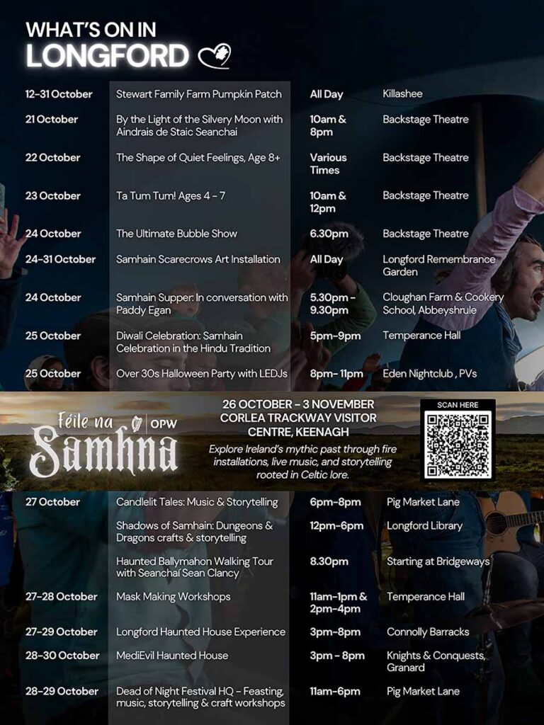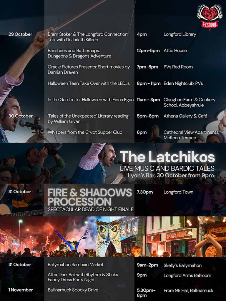 The Dead of Night Halloween Festival runs from 25 to 31 October 2025 across Longford, featuring folklore, fire, and theatre.