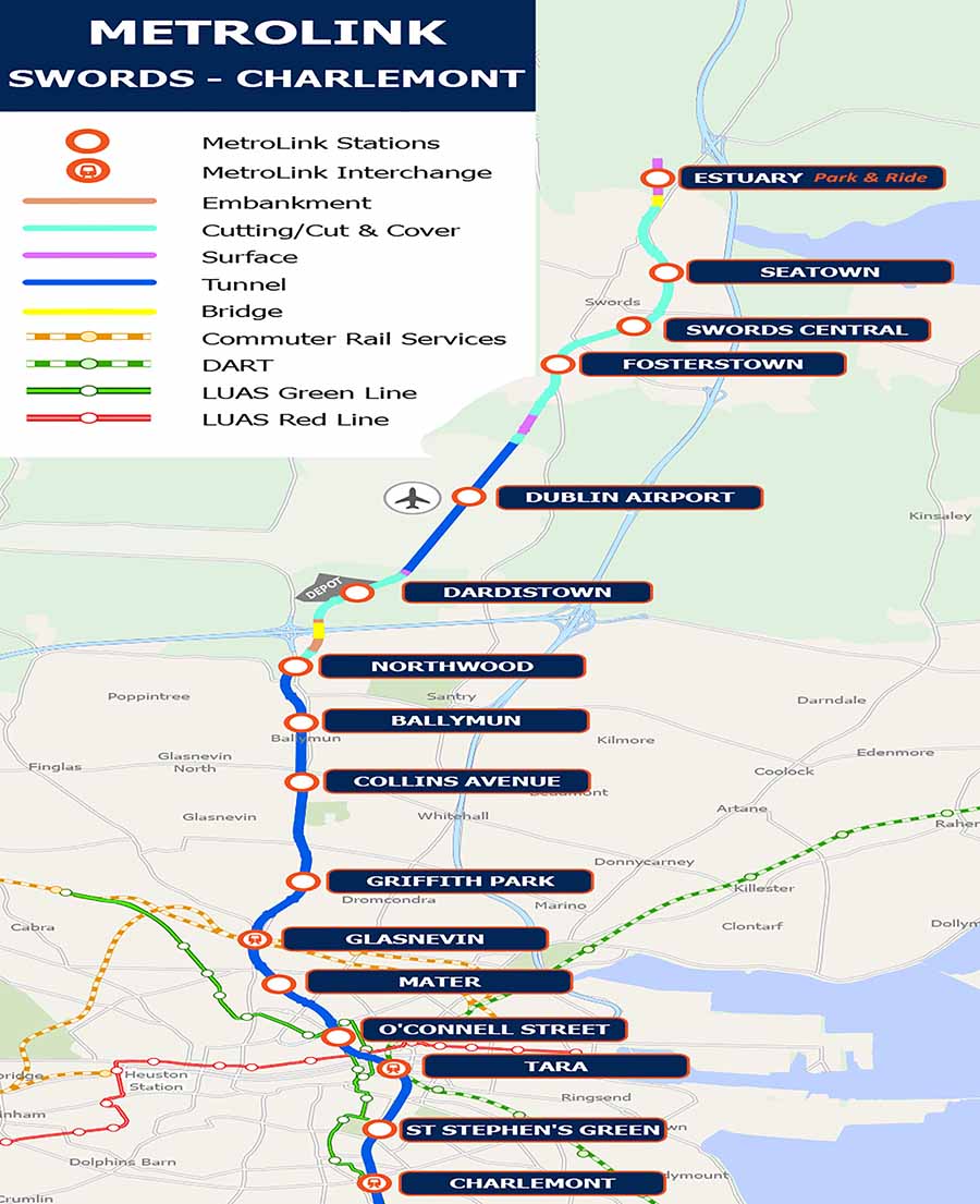When completed, the MetroLink is expected to accommodate up to 53m passengers annually, covering 16 new stations including the Dublin Airport, Ballymun, and various hospitals and universities.