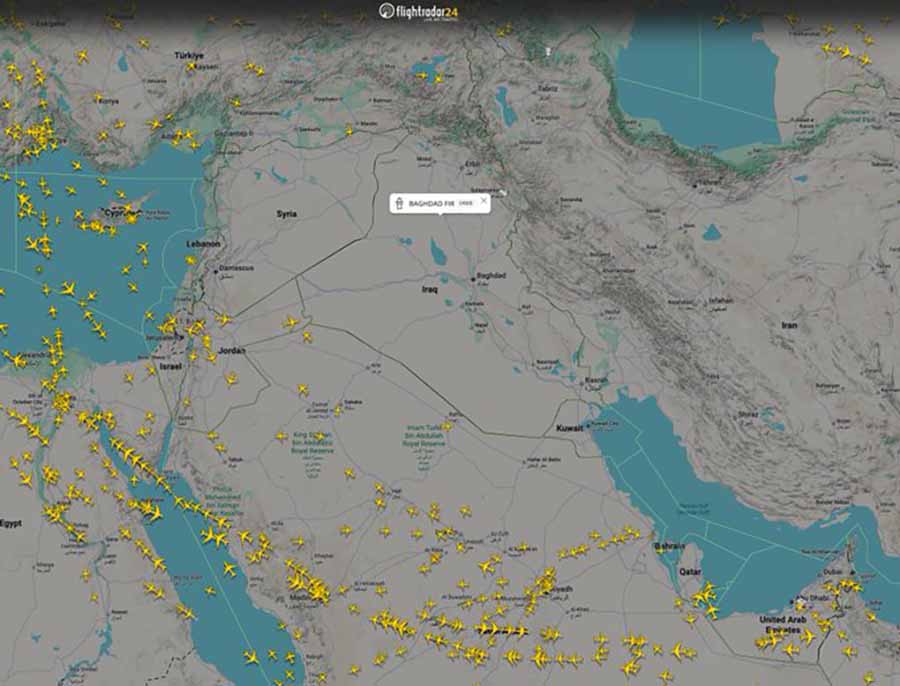 Tá staid mheasctha le feiceáil in aerspás an Mheánoirthir tar éis teannas réigiúnach a thosaigh i ndeireadh Feabhra. Tá roinnt tíortha (UAE, Catar agus Bairéin) ag oscailt bealaí go páirteach agus tá na haerlínte móra ag méadú a gcuid eitiltí ó Dubai, Abu Dhabi agus Doha, ach tá an acmhainn i bhfad faoi bhun na gnáthleibhéil. Tá spás aeir dúnta go hiomlán fós in Iaráin, san Iaráic, sa tSiria agus in Iosrael, rud a chuireann ar aerlínte domhanda bealaí fada timpeall a ghlacadh trí Tuirc, an Éigipt nó farraige theas na hAraibe, rud a chuireann uaireanta breise agus costais mhóra leis na turais.
