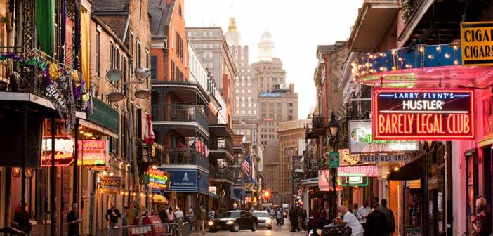 Head west along St Peter Street or St Ann Street to reach Bourbon Street, the thoroughfare known for its bars and music venues that stretches several blocks through the Quarter with neon signs and balconies above the pavement.