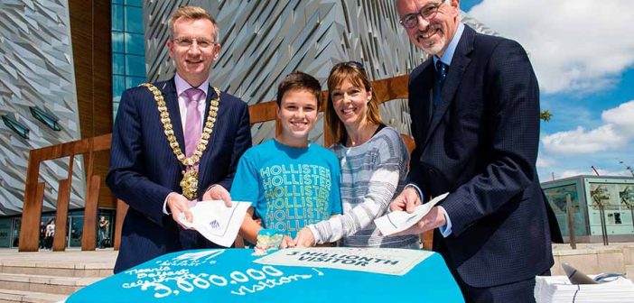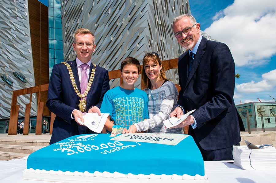 The Titanic Centre had a record number of visitors for a single day on August 9, with 4,200 visitors. This week it hosted its three millionth visitor this week since it opened in 2012. Kathy Jefferson from Telford, England is pictured with Belfast mayor Brian Kingston, Titanic Belfast chief executive Tim Husbands and Tourism Ireland’s Vanessa Markley.