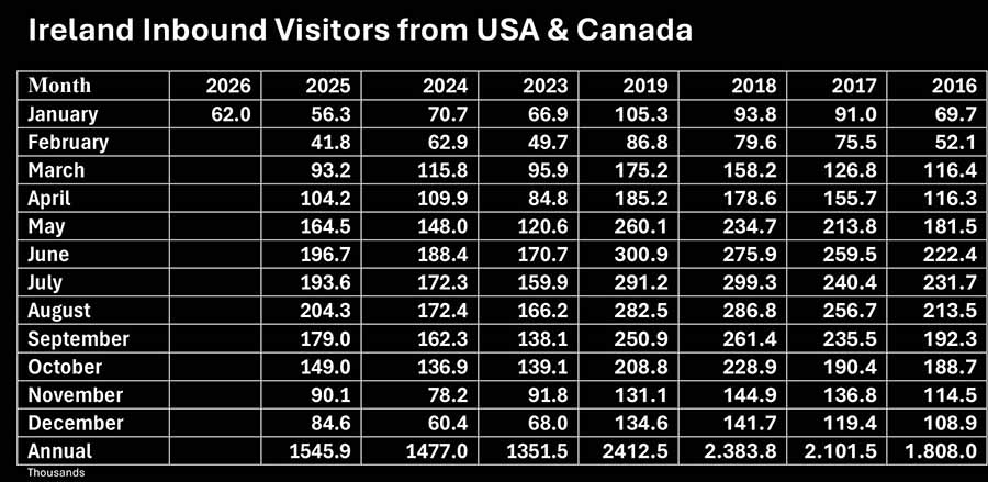 Visitor numbers to Ireland from North America in January are up 10.1pc on January 2025 and down -41.1pc on pre-pandemic