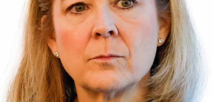 Elizabeth Lund, Senior Vice President, Quality at Boeing speaks to gathered media in front of a slide detailing the plug door blow-out that occurred on Jan. 5, 2024 on Alaska Airlines flight 1282 at the Boeing 737 factory Tuesday, June 25, 2024 in Renton, WA. 227340