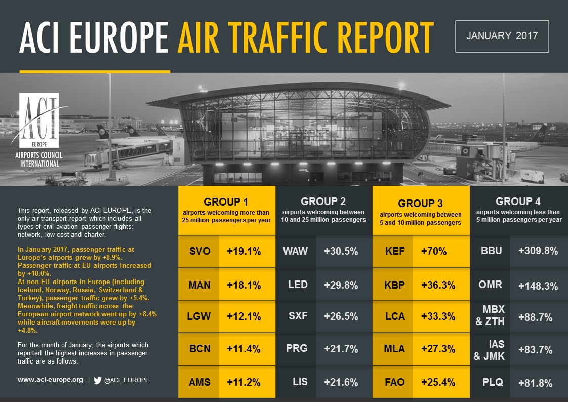 Olivier Jankovec, Director General of ACI Europe, said “2017 is off to a rather booming start for air traffic, confirming the momentum which gradually built up in the second half of 2016. The performance of the EU market is especially impressive, with January passenger volumes up by nearly a quarter over the past two years. Coupled with solid gains in freight traffic, this primarily reflects much improved macro-economic conditions – especially in the Eurozone where unemployment is at its lowest in eight years and the economy has recorded 14 consecutive quarters of growth.”