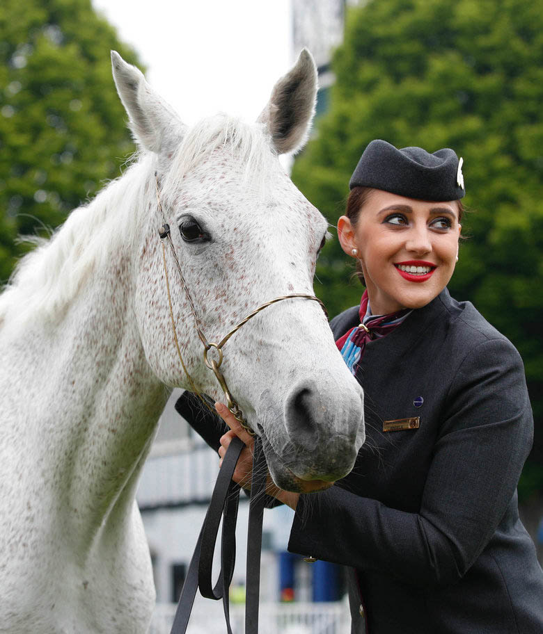 Spice, the Arab horse, and cabin crew member team up to announce Qatar Airways as the Official Airline Partner of the 2017 RDS Dublin Horse Show