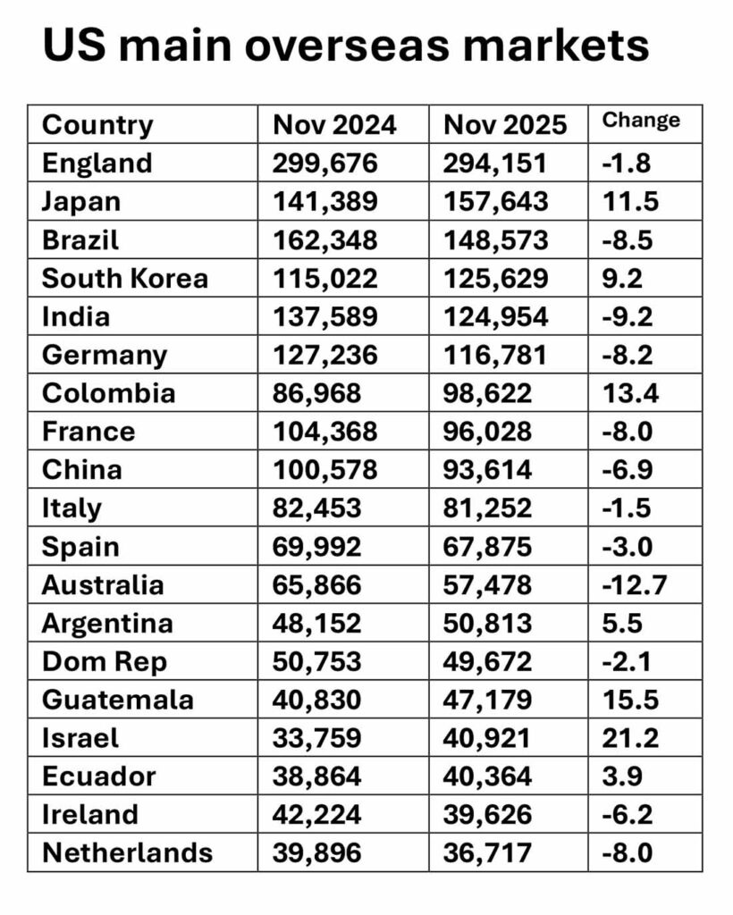 Ireland is the 19th most important market for travel to the USA in November, sending 39,626 visits, down 6.2pc on 2024 and 14.7pc on pre-pandemic. Rolling annual was 493,211, marginally up by 0.2pc on the twelve months to November 2024.