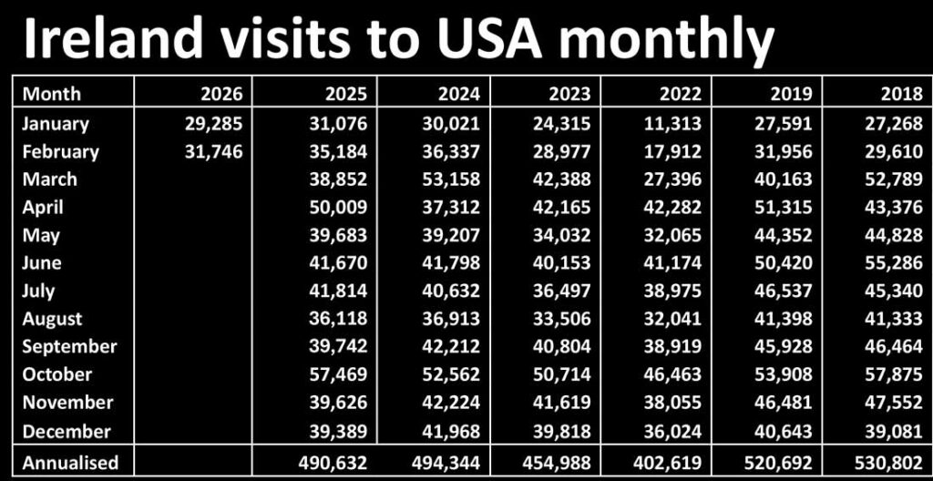 The United States recorded 31,746 visits from Ireland in February 2026, down 5.8pc from January 2025 but up 6.1pc on pre-pandemic levels.