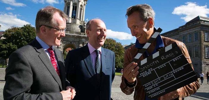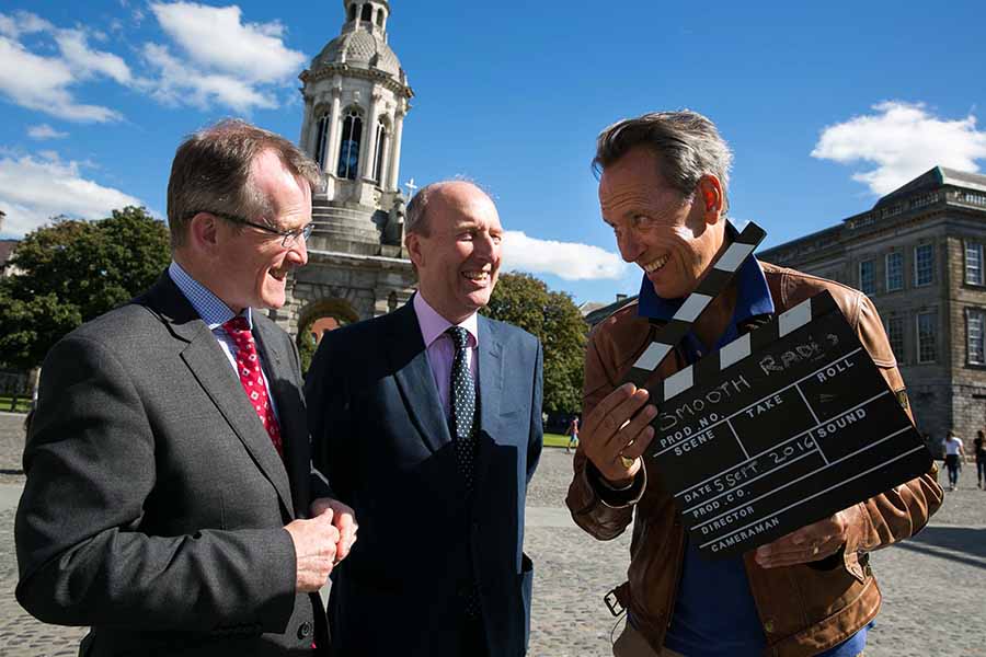 Richard E Grant launched Tourism Ireland’s €9m autumn campaign targetting late-season travellers including two new online videos for a promotion with Smooth Radio in Britain. Picture shows Niall Gibbons, CEO of Tourism Ireland; Tourism Minister Shane Ross and Richard E Grant with Trinity College campanile.