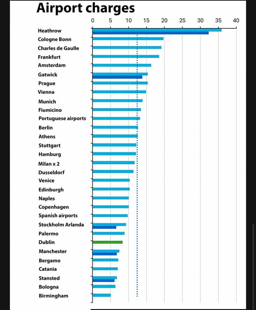 “Airport charges at Dublin Airport are set out by the Irish Aviation Authority and remain among the lowest in Europe (see lIA graph below). While the IAA sets a maximum price cap through periodic determinations, currently covering 2023-2026, Dublin Airport is responsible for setting individual charges within that cap following consultation with users.”