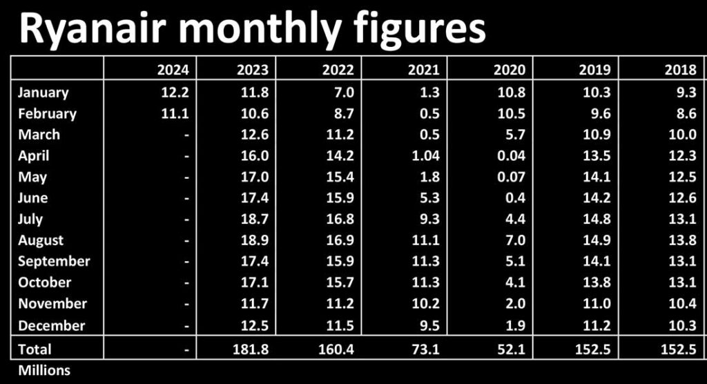 Ryanair monthly passenger figures for February were 11.1m, up 5pc on 2023 and 15.6pc on 2019.