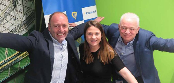 It says it will fly 15.6m passengers and grow by 5pc in Ireland. {picture shows Kenny Jacobs, Lisa Cashin and Eddy Wilson at a media briefing in Swords.