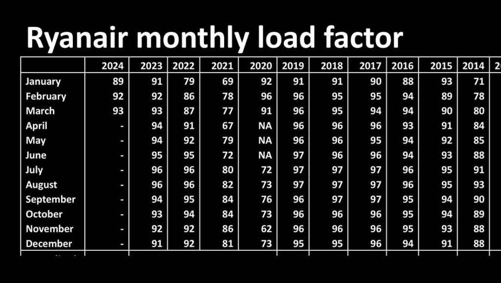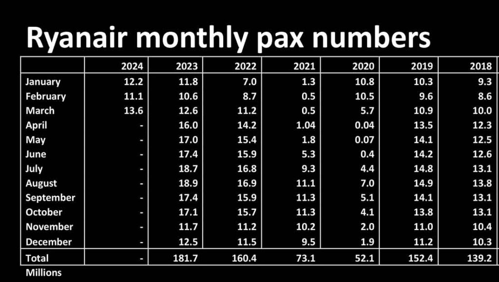 Ryanair monthly passenger figures for March 2024 were a record 13.6m, up 8pc on March 2023 and 25pc on pre pandemic March 2019.