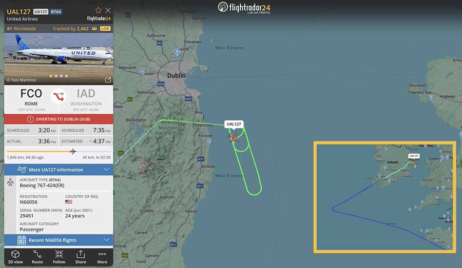United Airlines flight UA127, a Boeing 767-400ER en route from Rome to Washington Dulles, returned to Dublin Airport yesterday after a reported engine failure prompted the crew to dump fuel and execute a diversion.