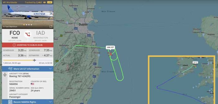 United Airlines flight UA127, a Boeing 767-400ER en route from Rome to Washington Dulles, returned to Dublin Airport yesterday after a reported engine failure prompted the crew to dump fuel and execute a diversion.