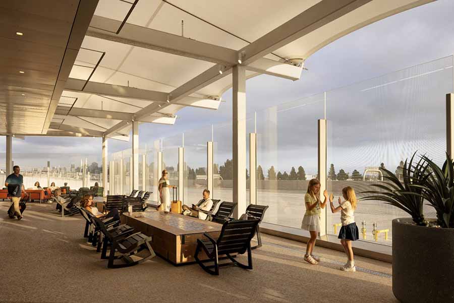 Designed by Gensler, the terminal incorporates curved glass, wooden ceilings, and an outdoor terrace with views of Harbor Island and downtown San Diego.