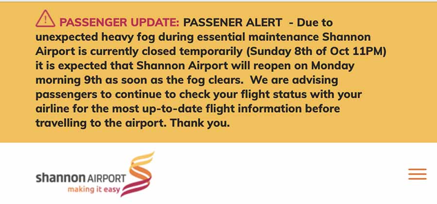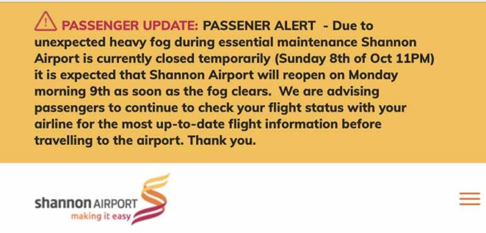 Shannon Airport Group said that as a result of unexpected heavy fog during a period of essential taxiway maintenance work caused the closure of the airport at 11pm last night, Sunday October 8.