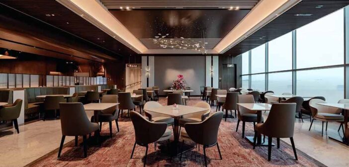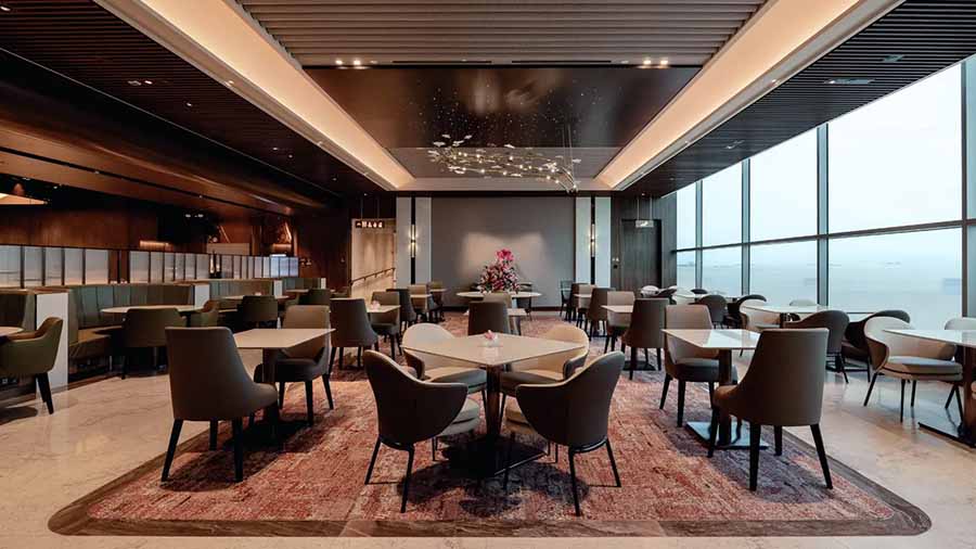 First-class SilverKris Lounge in Terminal 2 spans 1,050 sqm with 97 laser-cut Plexiglas batik flowers.