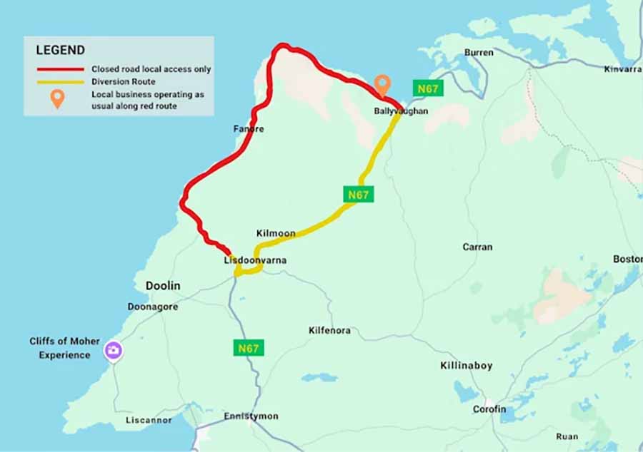 Visitors to the Cliffs of Moher travelling south form Ballyvaughan are requested to avoid the coastal road until further notice and utilise Corkscrew Hill instead.