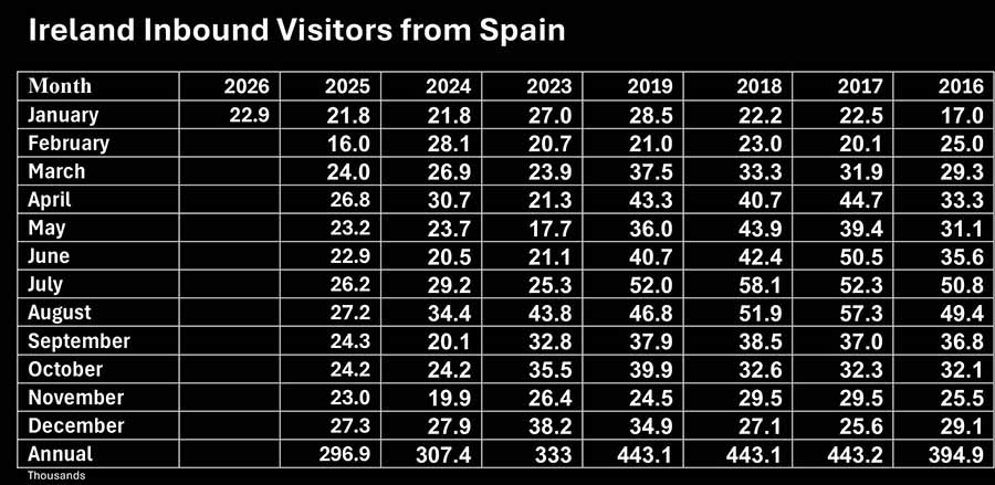 Visitor numbers to Ireland from Spain and Portugal in January are up 5.0pc on January 2025 and down -19.6pc on pre-pandemic