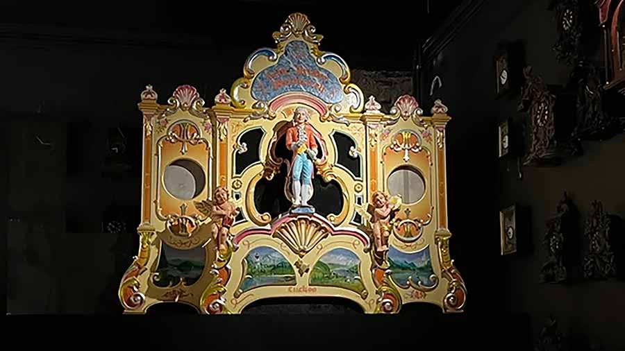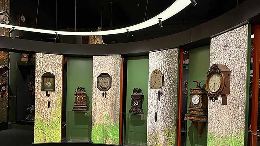 The exhibition includes restored pieces such as a fairground organ cuckoo clock along with one day two day and eight day models and various striking mechanisms. The new wing features backlit walls designed to evoke the Black Forest environment with sensory elements including leaf rustle sounds and cuckoo calls. Colman Curran who has collected clocks for forty five years described the approach as a deliberate shift from the more formal style of the main museum.