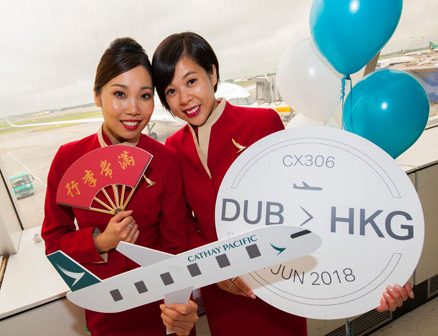 Christine Wang and Winnie Phan at the gate ceremony for the inaugural flight from Dublin to Hong Kong, June 2, 2018