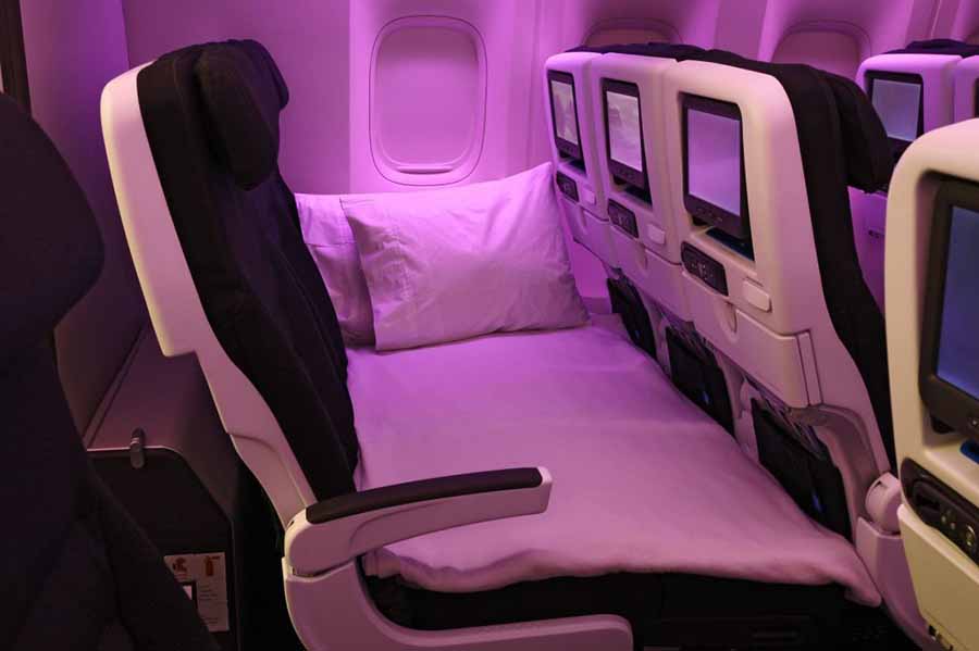 The Relax Row sits behind Premium Plus in the cabin hierarchy. Each aircraft will feature up to 12 of these sections with an average of nine. Adjustable leg rests extend to a 90 degree angle and the three seats form a continuous surface for lying down.