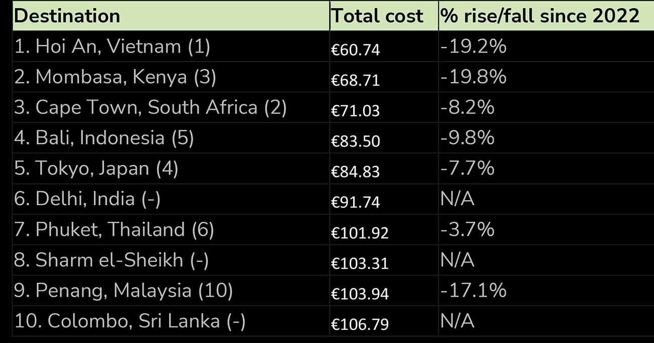 Hoi An in Vietnam has been ranked the best value for the second year in a row, with a 19.2pc decrease in prices in 2022. India and Sri Lanka are new entries in the top 10 list.