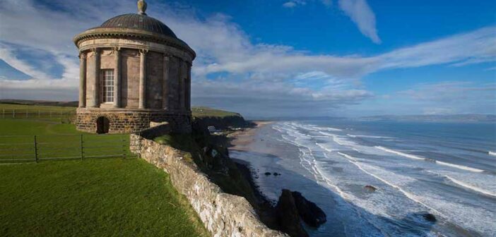 - Mussenden Temple: Located precariously on a 120-foot cliff overlooking Downhill Strand and the Atlantic Ocean, this circular temple, built in 1785 as a summer library for the Earl-Bishop’s niece, Frideswide Mussenden, is one of Ireland’s most photographed landmarks. Modeled after the Temple of Vesta in Tivoli, Italy, it features an inscription from Lucretius’ De Rerum Natura: “’Tis pleasant, safely to behold from shore, the troubled sailor, and hear the tempests roar.” The temple’s interior, lined with bookshelves and marble busts in its heyday, is closed to the public except during guided tours or special events due to cliff erosion concerns (stabilized by the National Trust in 1997). Visitors can admire its exterior grandeur and enjoy panoramic views west to Magilligan Point and Donegal, and east to Castlerock, Portstewart, Portrush, and Fair Head. The temple featured in Game of Thrones as Dragonstone’s exterior (Season 2, Burning of the Seven Gods).