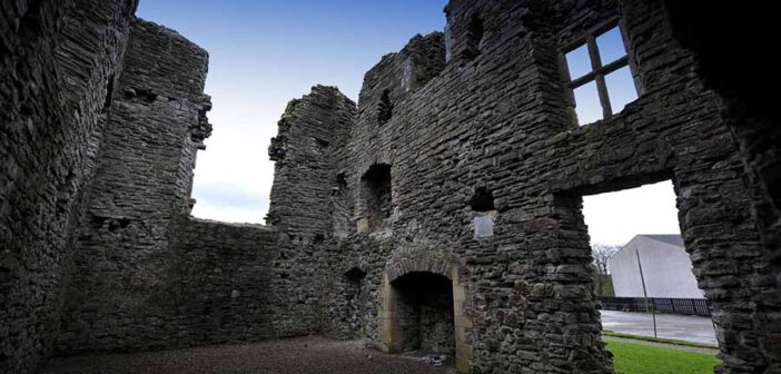 - Ruins and Structure: The castle, sometimes called Ballydonnelly Castle, was constructed on the site of an earlier O’Donnelly fort, a stronghold of the O’Donnelly sept, marshals to the O’Neill clan. The substantial ruins include a three-storey mansion with attics, large mullioned windows, and tall chimney stacks, originally U-shaped but now L-shaped due to the missing northwest wing. The gatehouse, the oldest surviving feature, showcases Tudor-style doorways, murder-holes, and gun-loops, with the Caulfield arms displayed above the entrance. A joist dated to around 1282 via dendrochronology suggests parts of the earlier fort will be incorporated, adding historical depth.
