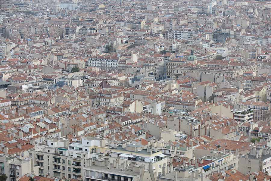 Red tile roof tops of Marseilles as seen from Notre-Dame de la Garde (literally: Our Lady of the Guard), known to local citizens as la Bonne Mère
