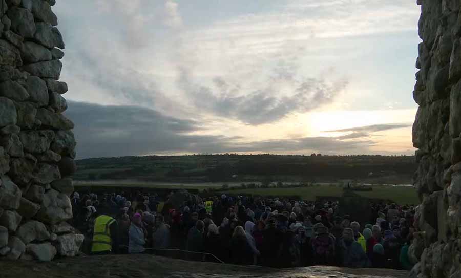 Local Government and Heritage to livestream the event worldwide. Bright skies with some cloud cover allowed sunlight to enter the monument through the roof box and illuminate the interior passage. Hundreds gathered outside to celebrate the occasion.